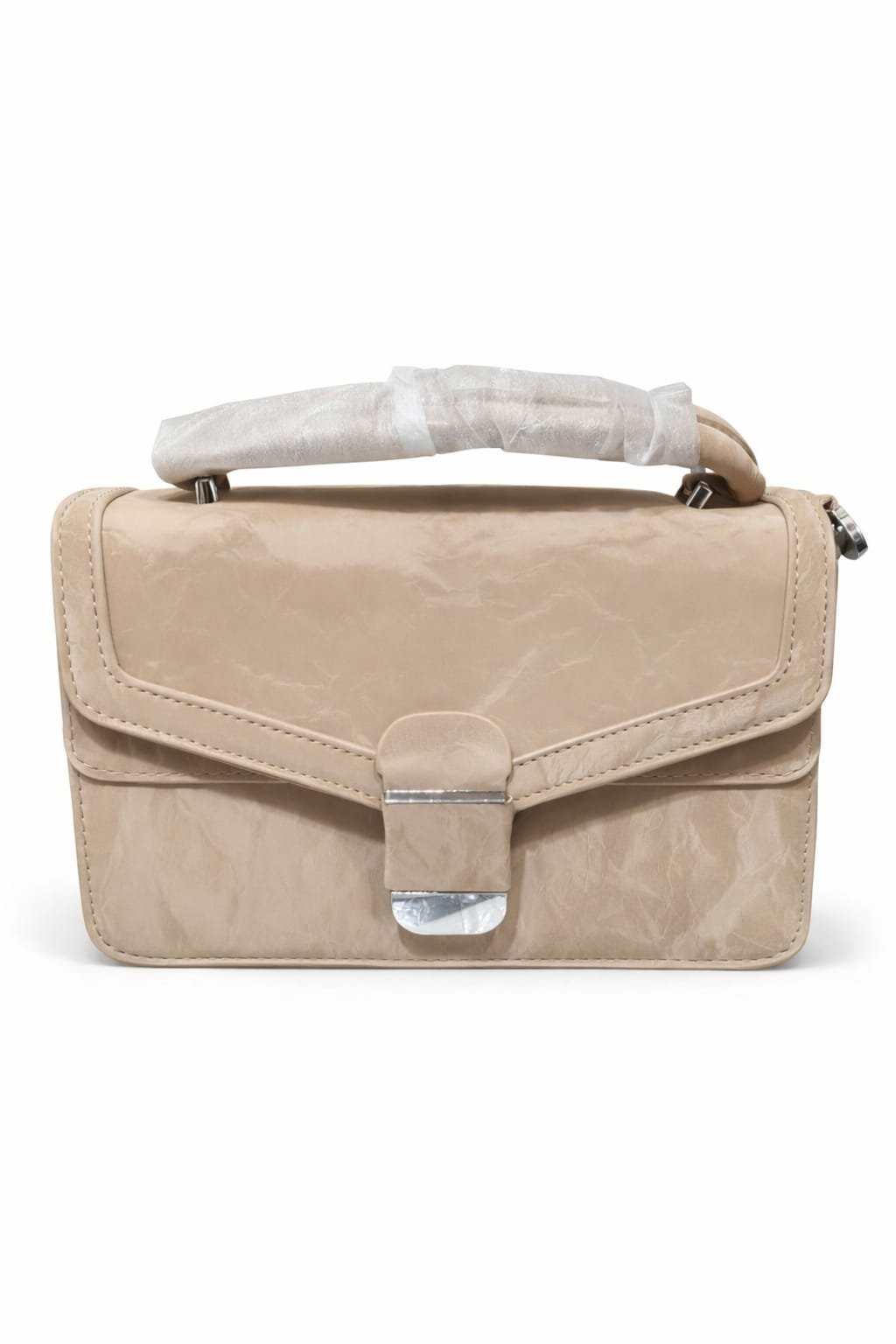 Elevate your accessory game with this sophisticated beige top-handle bag, featuring a unique crinkled leather texture that adds a modern, high-fashion edge to a classic silhouette. Designed for the woman on the go, this versatile piece functions as both a structured handheld satchel and a hands-free crossbody bag. The sleek envelope flap is secured by a polished silver-tone clasp, ensuring your essentials stay safe while maintaining a minimalist aesthetic. Whether paired with a professional blazer or a casual weekend outfit, its neutral “latte” tone makes it a seamless addition to any wardrobe.