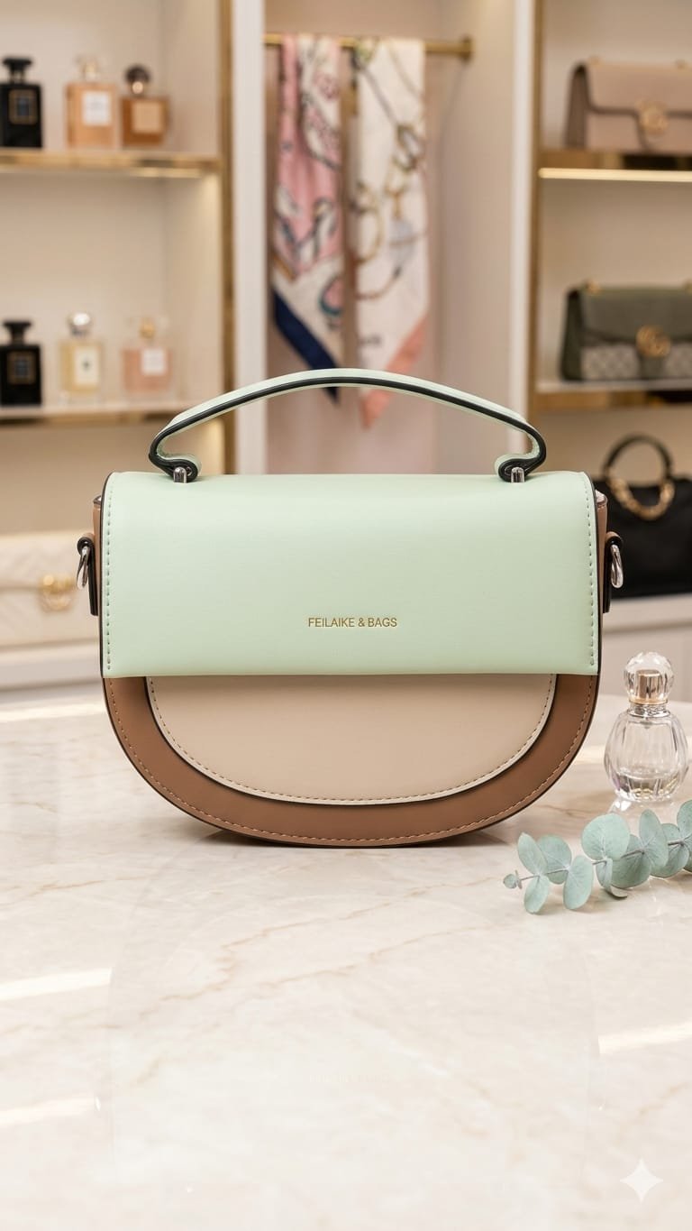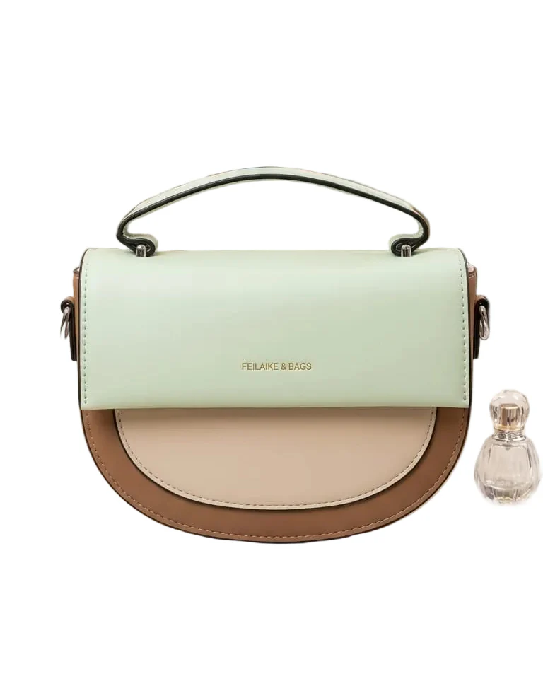 Step out in style with this Contemporary Color-Block Saddle Bag, featuring a sophisticated three-tone palette of mint green, cream, and warm mocha. Its unique half-moon silhouette and structured flap design offer a modern twist on a classic aesthetic. Crafted with a premium smooth finish and branded metallic lettering, this versatile accessory functions as a sleek top-handle bag or a convenient crossbody. Perfectly sized for your essentials, it’s the ideal companion for brunch dates, office days, or city strolls.