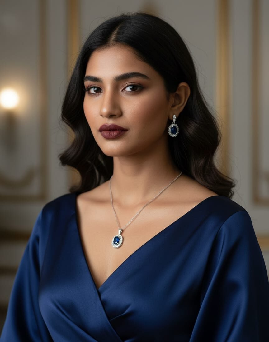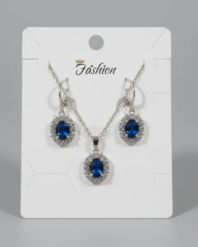 A timeless 3-piece set featuring a deep sapphire-blue oval gemstone pendant and matching stud earrings.