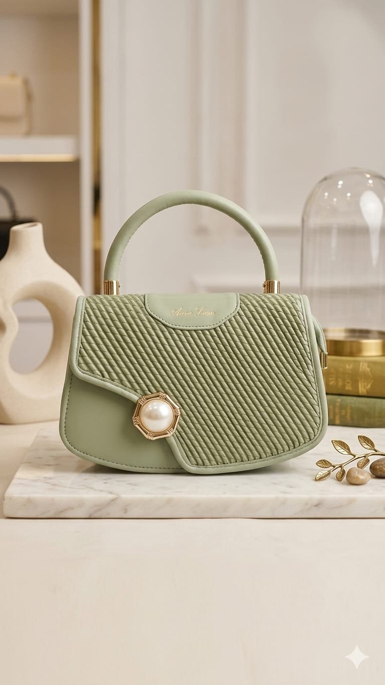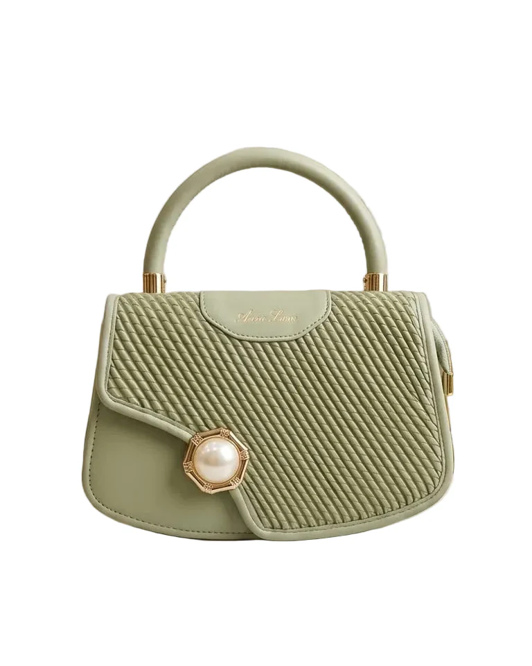Step into timeless elegance with this sage green top-handle handbag. Designed with a unique diagonal quilted texture and a sophisticated asymmetric flap, this bag is a true conversation starter. The standout feature is the oversized, gold-rimmed pearl embellishment that serves as a luxurious focal point. Whether you’re attending a spring garden party, a wedding, or an upscale brunch, its soft pastel hue and structured silhouette add a touch of “old money” aesthetic to any ensemble.