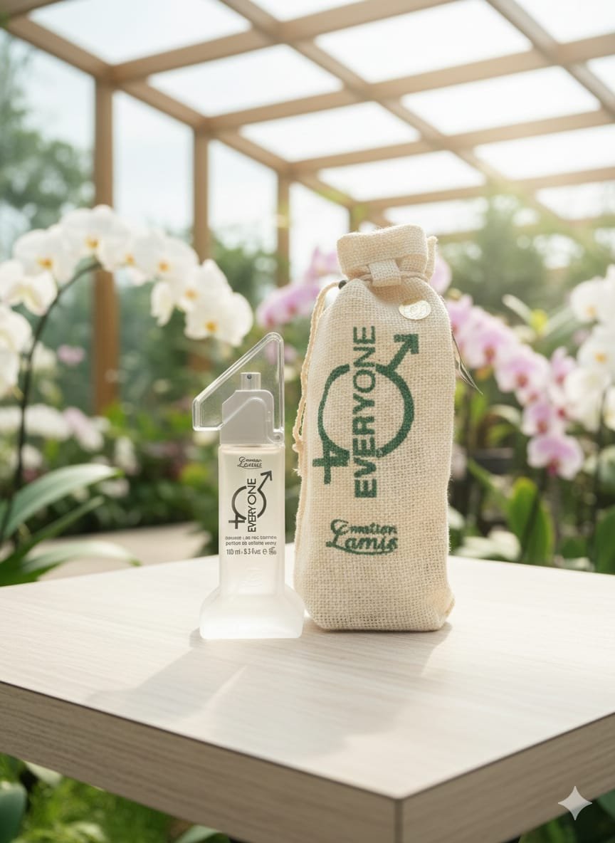 Embrace a scent designed for all with Everyone by Creation Lamis. This unique fragrance is celebrated for its versatile, gender-neutral appeal, symbolized by the intertwined male and female icons on the bottle. It comes in a frosted, modernistic bottle with a distinctive triangular cap. For a touch of rustic charm, the fragrance is packaged in a drawstring burlap sack, making it an excellent gift for those who appreciate eco-conscious and artisanal aesthetics.