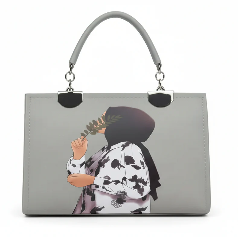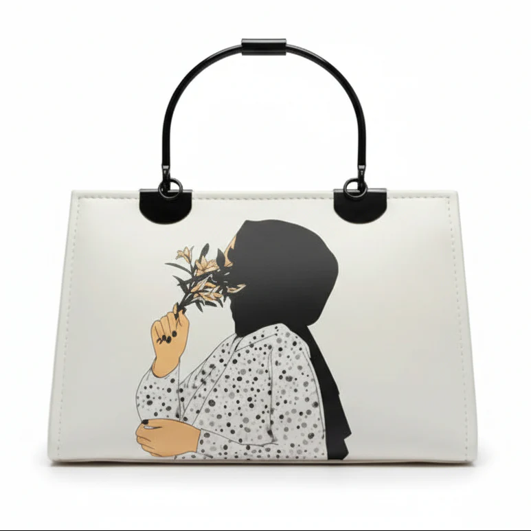 Make a statement with this unique structured box bag, blending modern accessory design with soulful illustrative art. The smooth black matte finish provides the perfect canvas for a vibrant graphic depicting a woman in a bright orange hijab holding a bouquet of delicate white flowers.