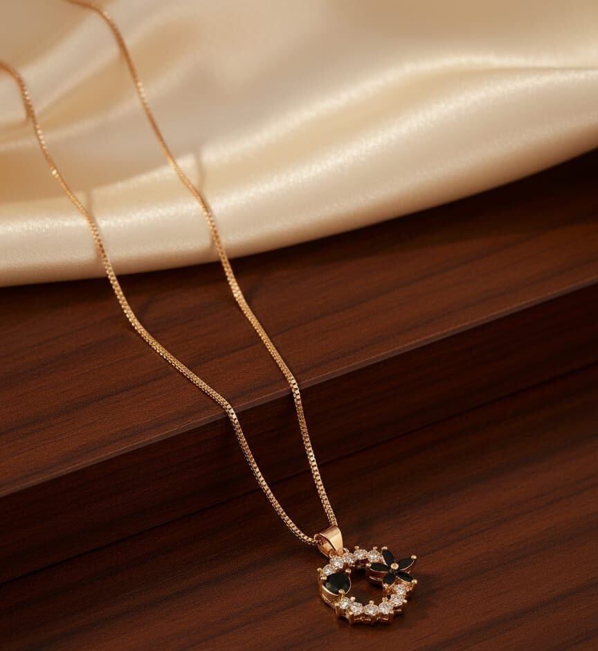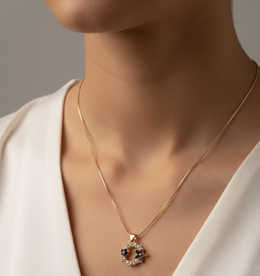 rose blossom halo necklace – elegant circular crystal pendant in 14k gold finishGold-Tone Floral Wreath Pendant with Black Onyx Accents