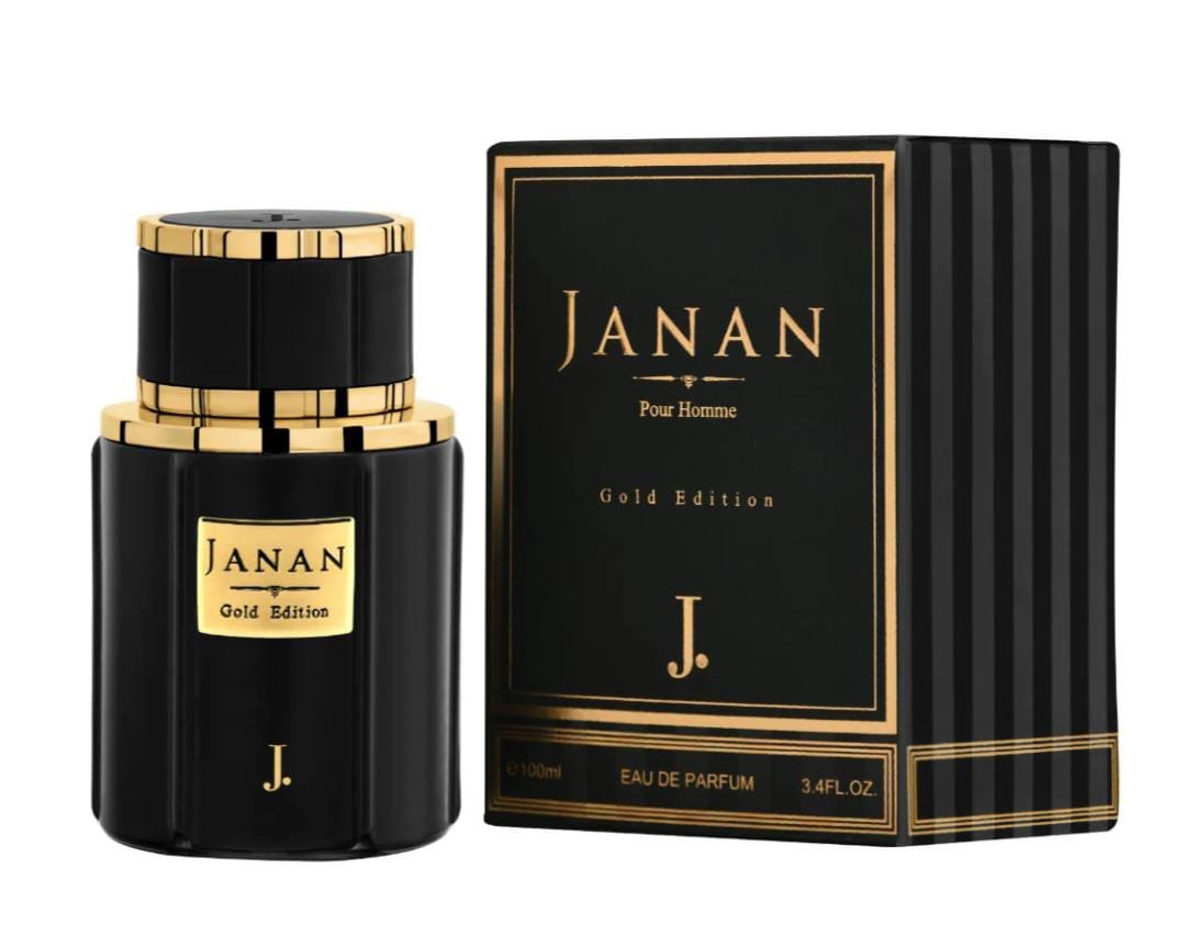 Janan Gold Edition by J., a refined fragrance crafted specifically “Pour Homme” (for men). This Eau de Parfum is presented in a sophisticated, deep black bottle accented with regal gold detailing, reflecting the high-quality essence within. Designed for the modern gentleman, it offers a long-lasting, powerful scent profile that balances traditional elegance with contemporary luxury.