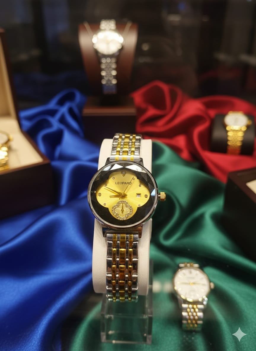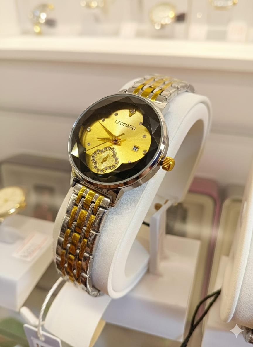 Experience the brilliance of light with the Leopard two-tone fashion watch. This eye-catching timepiece is defined by its geometric faceted glass crystal, which is precision-cut to catch and reflect light like a gemstone. The rich gold sunray dial features a unique clover-shaped sub-dial accent and a convenient date aperture at the 3 o’clock position, blending high-fashion with everyday functionality.