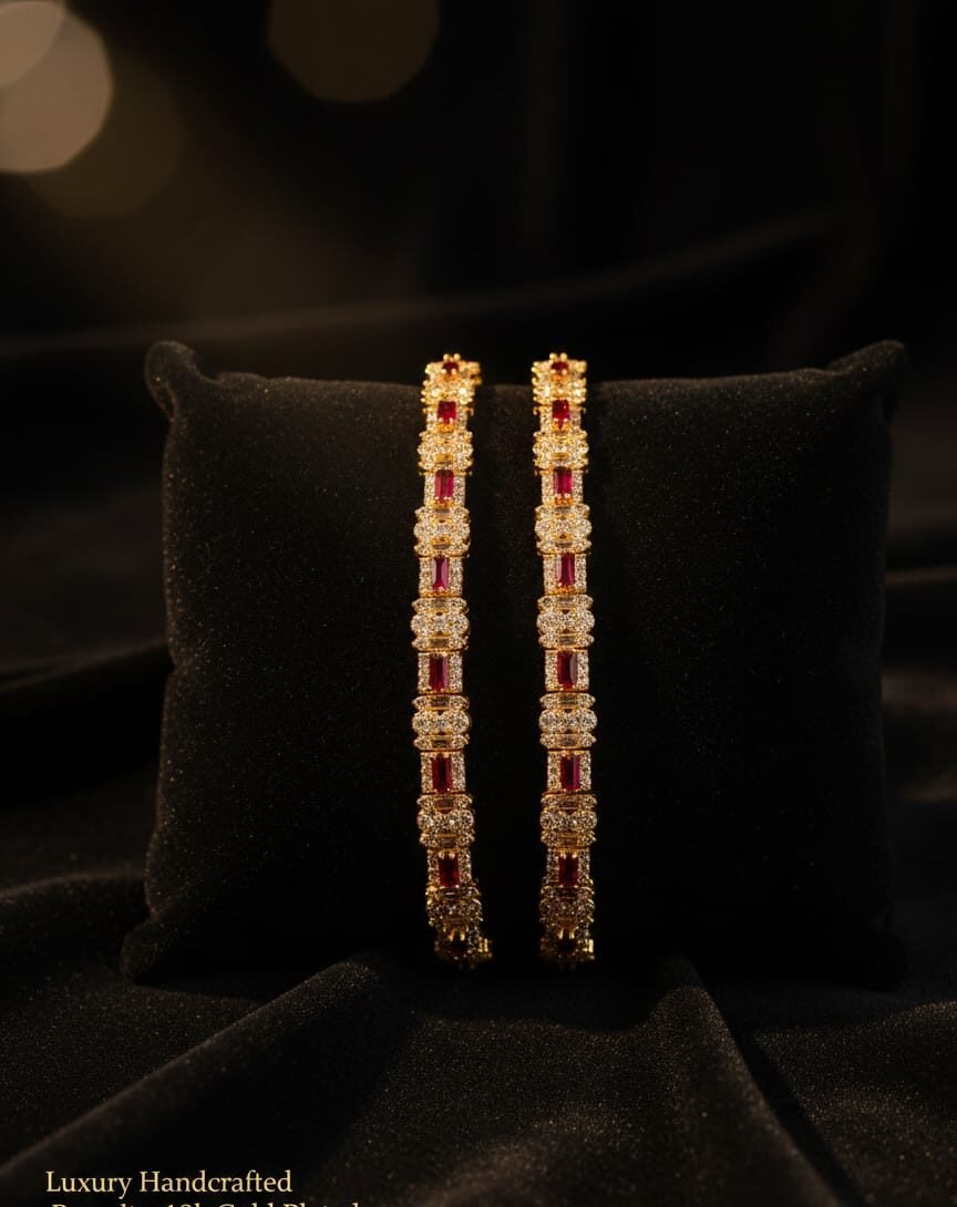 The design alternates between rich, rectangular ruby-red stones and clusters of brilliant clear crystals.