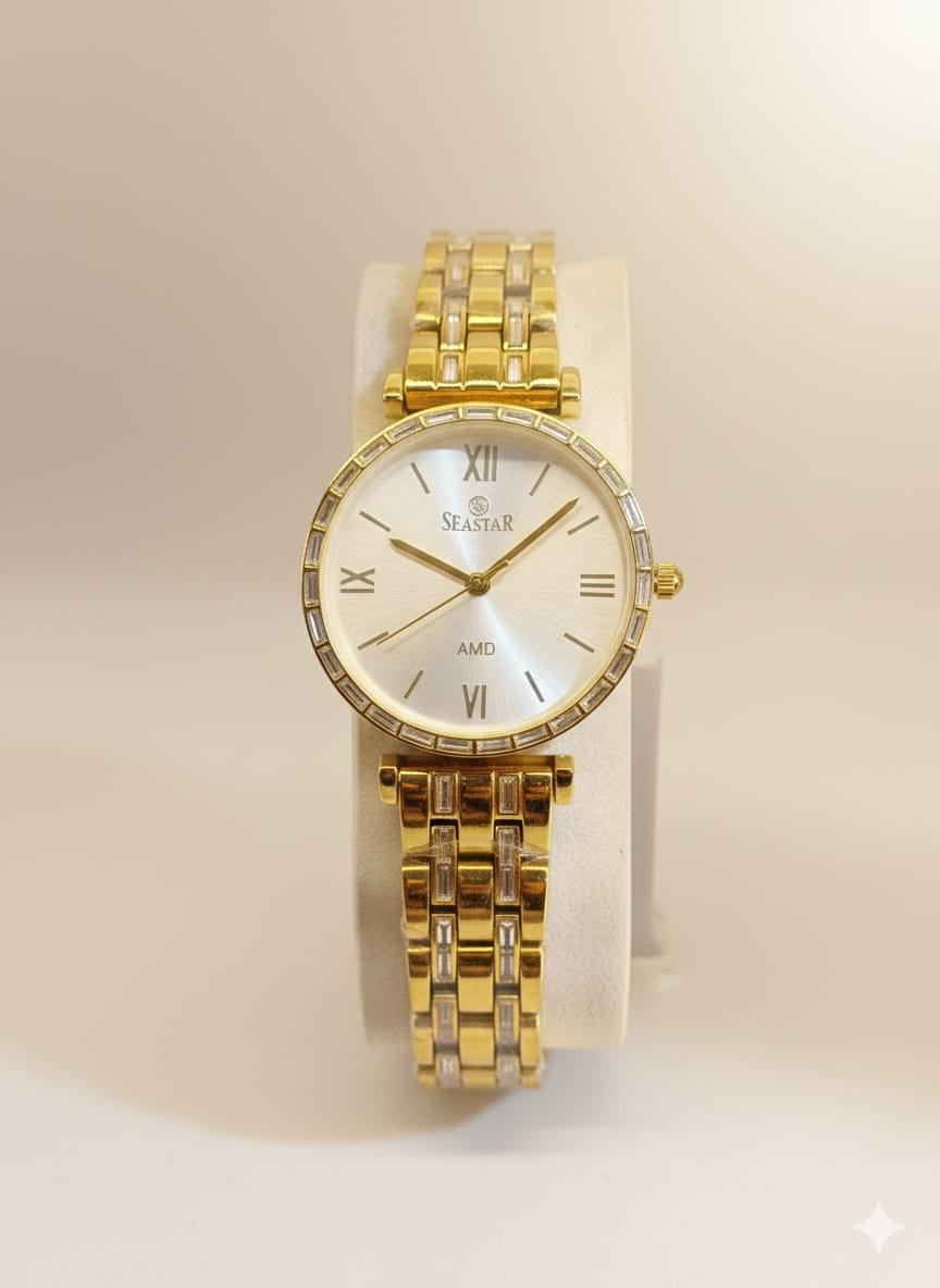 Radiate timeless elegance with this exquisite Seastar gold-tone bracelet watch. This isn’t just a timepiece; it’s a statement accessory designed for those who appreciate the finer things. Featuring a sophisticated baguette-cut crystal bezel and a matching crystal-encrusted link bracelet, this watch offers a seamless blend of luxury and precision.