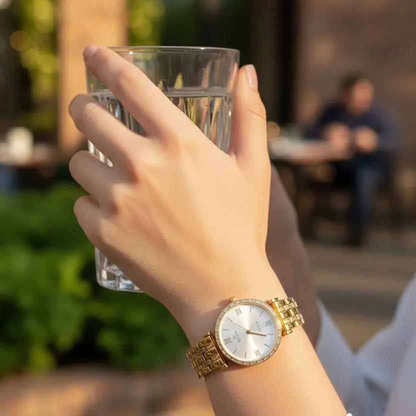 The silver sunray dial provides a beautiful contrast against the gold-tone hands and Roman numeral markers, ensuring clear legibility while maintaining a high-fashion aesthetic. Perfect for weddings, formal events, or elevating your daily ensemble.