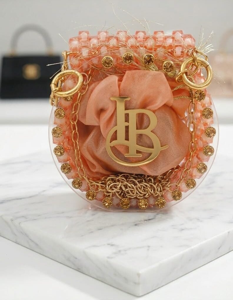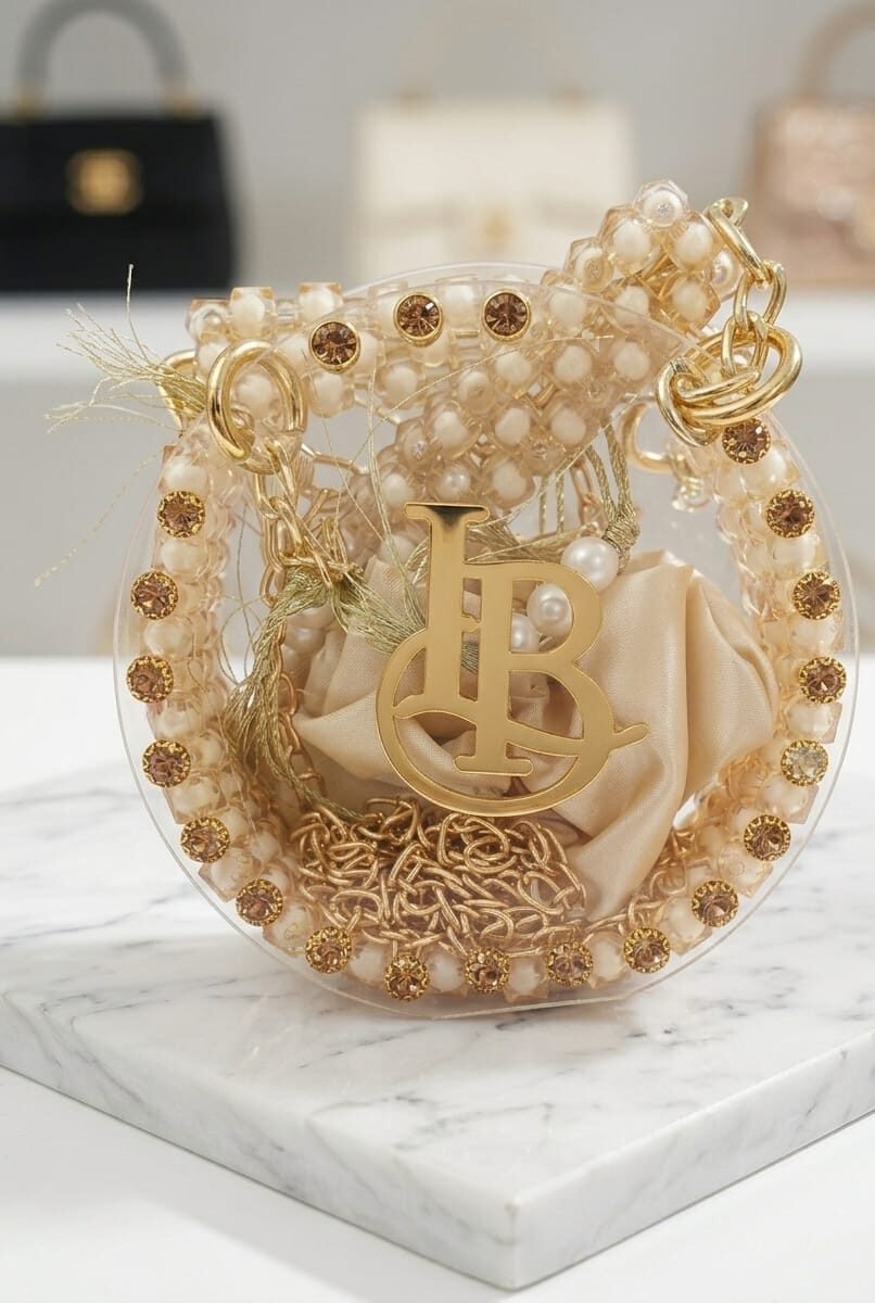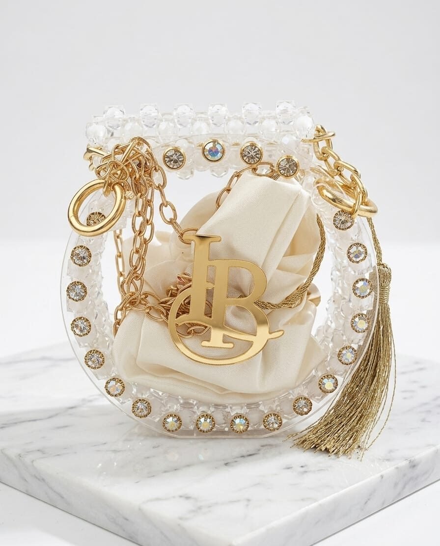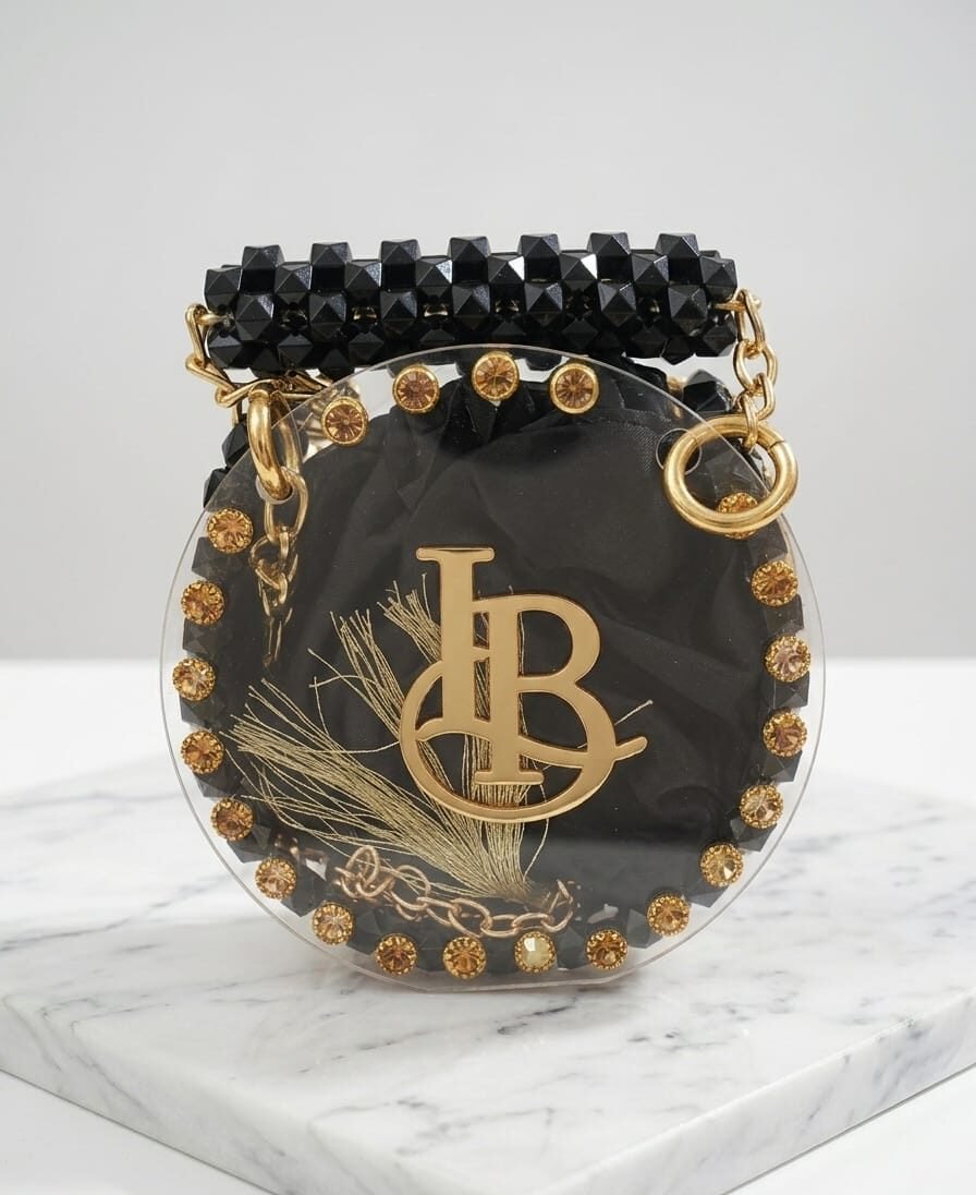 Elevate your evening ensemble with this exquisitely crafted mini circular handbag. Merging modern transparency with vintage-inspired opulence, this piece features a clear acrylic frame encrusted with shimmering amber-tone crystals and a pearl-style beaded handle. The centerpiece is a bold, gold-finished “LB” monogram, framing an interior soft-satin drawstring pouch that keeps your essentials secure yet stylish. Whether carried as a top-handle or worn as a crossbody with its elegant gold chain, this bag is a masterclass in high-fashion detailing.