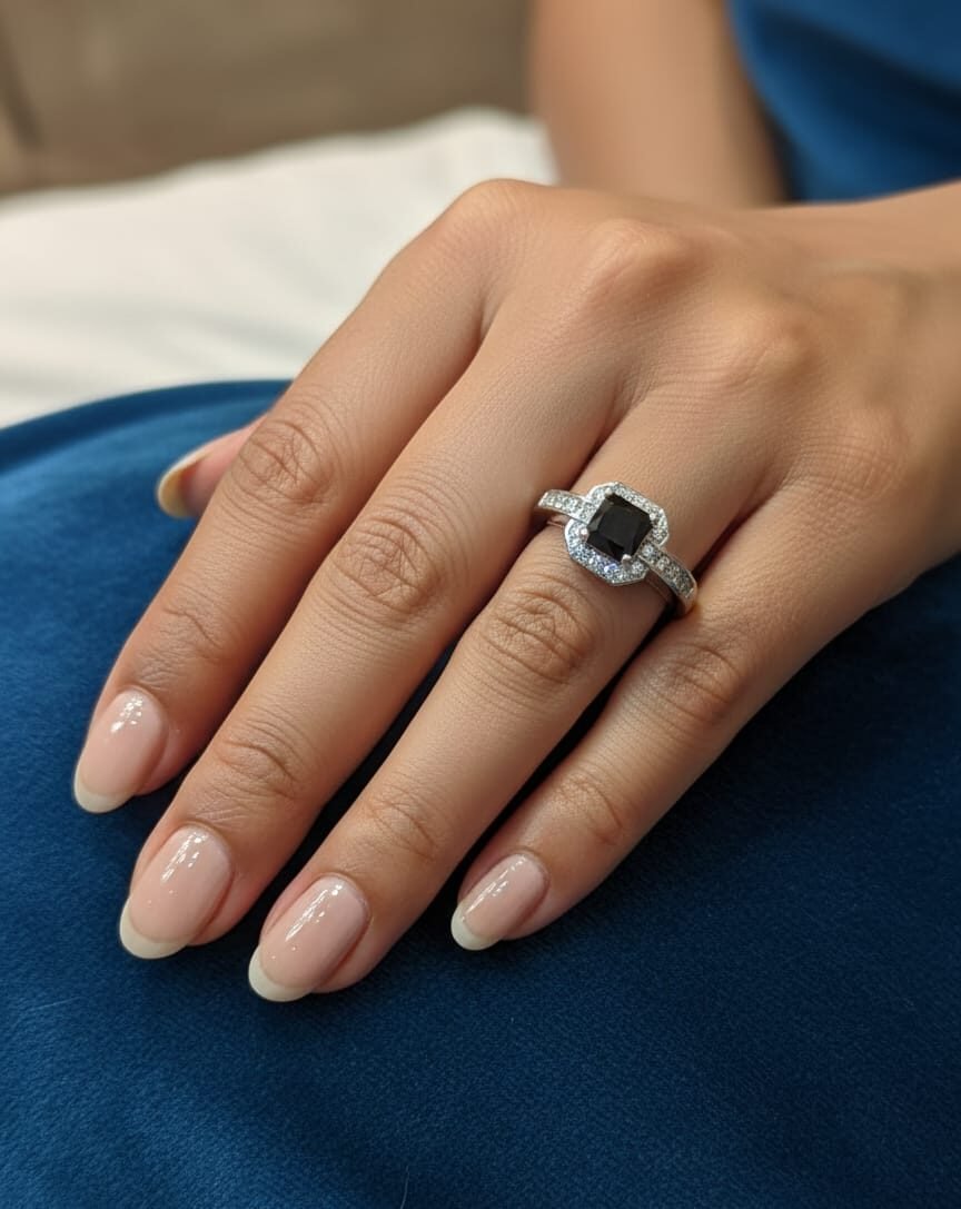 Centerpiece: Features a large, square-cut black center stone that provides a bold contrast against the silver-tone setting.
