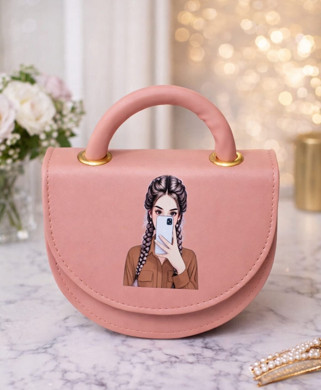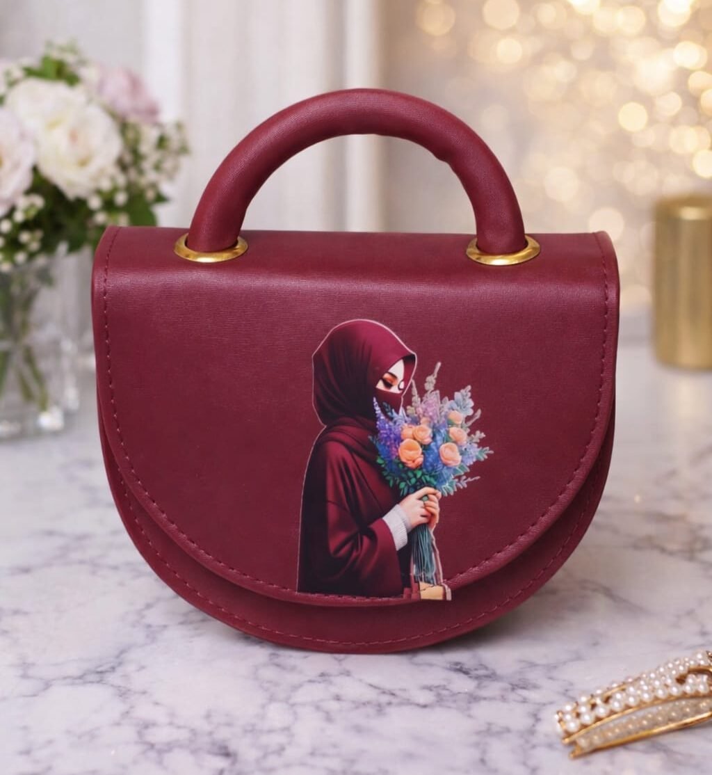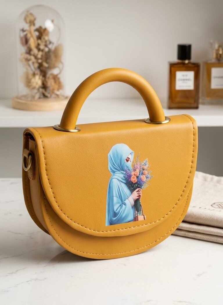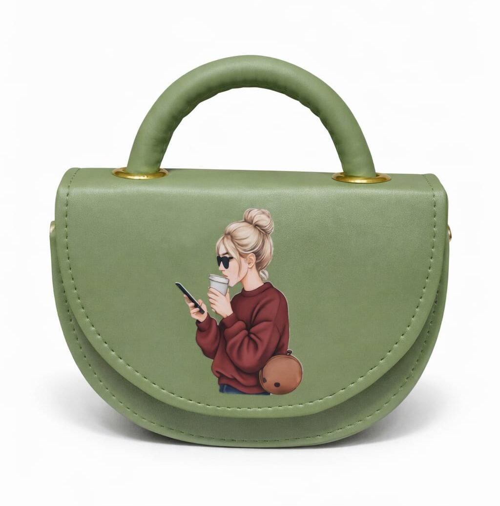 Embrace effortless modern style with our Urban Chic Mini Saddle Bag. Crafted from premium, smooth sage green vegan leather, this bag features a charming, contemporary graphic of a girl in a “coffee and commute” moment, adding a relatable, artistic touch to your daily look. The unique half-moon silhouette is complemented by a chunky, padded top handle and gold-tone hardware, making it the perfect companion for brunch dates, city strolls, or casual meetups.
